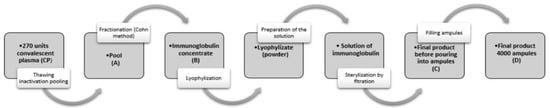 hIHGG anti-SARS-CoV-2 was manufactured for the first time by Biomed Lublin S.A. using the technique based on plasma fractionation with cold ethanol (Cohn’s procedure) []. The method consists of multiple selective precipitations of plasma proteins, using different ethanol concentrations, pH, temperature, and ionic strength. Plasma proteins are heat-inactivated, so the process proceeds within the 0–10 °C range. The active substance (lyophilized anti-SARS-CoV-2 immunoglobulin with a determined level of anti-SARS-CoV-2 antibodies) was suspended in a solution of glycine and 0.3% sodium chloride. The resulting product was filtered for clarification and sterilization. The FP was automatically packaged into 4000 (2 mL) ampoules.