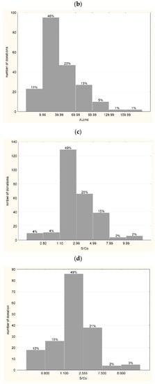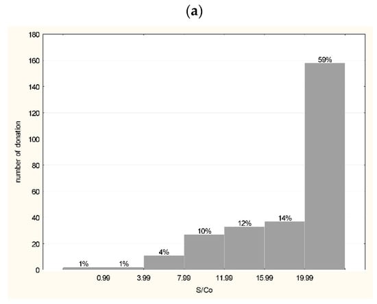 Histogram of anti-SARS-CoV-2 antibodies reactivity in EIA assays in convalescent plasma units used for the production of hIHGG anti-SARS-CoV-2: (a) Wantai anti-S1 RBD Ab Total—IgM, IgA and IgG (n = 270, S/Co < 1 negative result, S/Co > 19.9 over result); (b) iFlash anti-S1 IgG (n = 206, <10 AU/mL—negative); (c) Euroimmun anti-S1 IgG (n = 265, S/Co < 0.8 negative, 0.8–1.1 gray zone, >1.1 positive); (d) Euroimmun IgA (n = 177, S/Co < 0.8 negative, 0.8–1.1 gray zone, >1.1 positive). Above bars % of tested samples is presented.