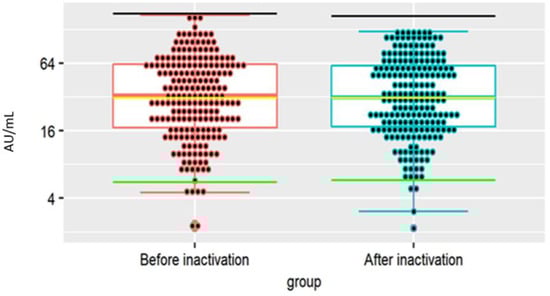 Anti-S1-RBD tests (total test) were positive for 268 out of 270 (99.26%) of CP units and negative for 2 (0.74%). In 158 samples (59%), the S/Co value was the highest (>19.9) (Figure 2a). The iFlash S1 SARS-CoV-2 IgG antibody test was positive in 183 out of 206 (88.83%) CP units and negative in 22 (11.16%). In 88 plasma units (42.71%) the antibody titer was >39.99 AU (arbitrary units)/mL. The low reactivity (9.99–39.99 AU/mL) was detected in 46.12% of units. Only four (1.9%) plasma units presented a very high IgG antibody titer (>129.99 AU/mL) (Figure 2b). A similar distribution was obtained with the Euroimmun assay designed for the semi-quantitative analysis of IgG antibodies. A positive result in the anti-S1 IgG test was obtained in 92.07% CP tested units and a negative result was found for 3.77%, while 4.15% of plasma units were in the gray zone. An S/Co value above 2.99 was determined in 43.40% of source plasma units, while the lowest reactivity (1.10–2.99 S/Co) was measured in 49% of units. As with the iFlash test, a small percentage (3.77%) of the samples presented the highest reactivity (S/Co > 7.99) (Figure 2c). The frequency of positive results in iFlash and Euroimmun tests did not differ (p = 0.23) but was higher (p < 0.05) in the Wantai test. A positive result in the anti-S1 IgA test was obtained in 75.14% of CP units and a negative result was obtained in 10.17%; 14.69% units were in the gray zone (0.80–1.10 S/Co). In 47 plasma units (26.55%) the S/Co value was >2.55, and reactivity was the lowest (1.10–2.55 S/Co) in 86.49% of units. Only 5.08% of units presented the highest reactivity (>7.5 S/Co) (Figure 2d). Additionally, the iFlash test was used to determine anti-SARS-CoV-2 IgG antibodies in plasma after pathogen inactivation. The titer of specific antibodies before and after inactivation did not differ (Figure 3).