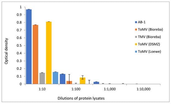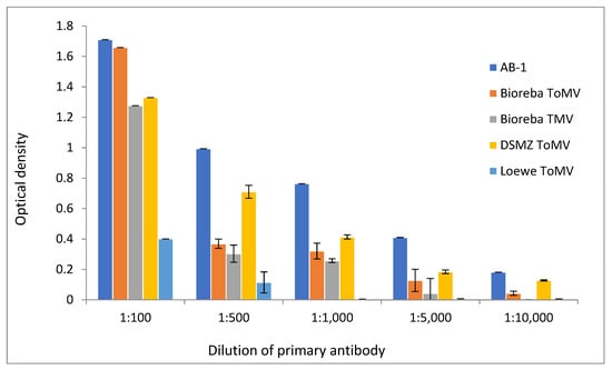 Sensitivity of the differently diluted compared antibodies in ToMV-infected tomato plants by the ELISA assay using five antibodies (new-developed AB-1, three commercial against ToMV—Bioreba ToMV, DSMZ ToMV, Loewe ToMV, and one commercial against TMV—Bioreba TMV) (mean values and standard deviation error bars).