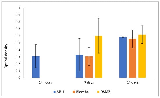 The AB-1 antibody and two commercial antibodies (Bioreba and DSMZ) were tested by ELISA for the ability to detect the virus in ToMV-positive plants of the Niki Zel F1 variety as soon as possible after virus infection. A different leaf from the plant than the one infected with the virus was always used for analysis. Only the AB-1 antibody was able to confirm the presence of ToMV very early on, only 24 h after artificial infection. Late infection was tested one and two weeks after inoculation, and all antibodies were able to detect the virus. Figure 4 summarizes the results of this testing at different times after the infected plants.