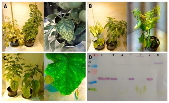 Symptoms of the ToMV SL-1 isolate in tomato, pepper, and eggplant. (A)—symptomatic infected tomato plant (left in pair) and control plant (right in pair), and leaf mosaic symptoms (right), (B)—symptomatic infected pepper plant (left in pair), control plant (right in pair), and leaf shedding from infected plant (right), (C)—symptomatic infected eggplant plant (left in pair), control plant (right in pair), and mild chlorosis on leaf (right), (D)—Western immunoblot detection of ToMV in plants of tomato, pepper, and eggplant. Lanes: 1—protein ladder, 2—positive control (virus), 3—infected tomato, 4—negative control tomato, 5—infected pepper, 6—negative control pepper, 7—infected eggplant, and 8—negative control eggplant.