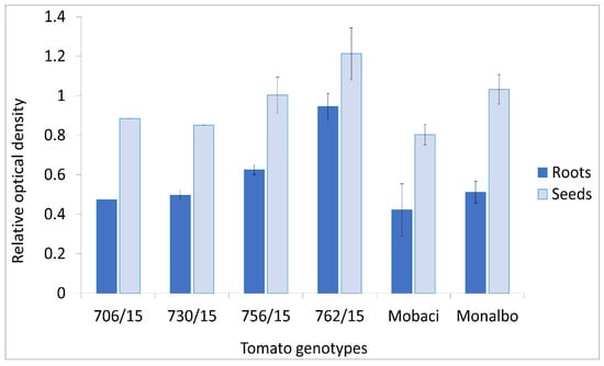 Detection of ToMV SL-1 in roots and seeds of infected tomatoes using the AB-1 antibody (mean values and standard deviation error bars).
