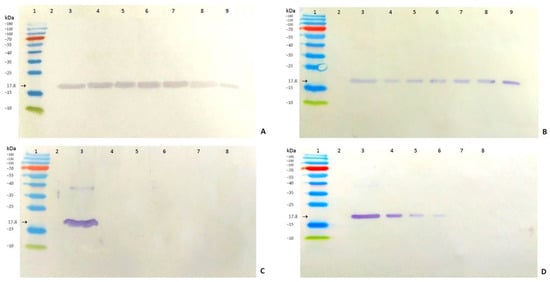 Persistence and resilience of ToMV in soil rhizosphere and root residues analyzed by Western immunoblots 24 months after the removal of the infected tomato plants from the soil. (A)—rhizosphere sample, (B)—root residues. Lanes: 1—protein ladder, 2—negative control, 3—positive control (ToMV SL-1), 4—line 706/15, 5—line 730/15, 6—line 756/15, 7—line 762/15, 8—Mobaci variety, and 9—Monalbo variety. (C)—Same rhizosphere samples after sterilization (tomato line 706/15), (D)— same root residues after sterilization (tomato line 706/15). Lanes: 1—protein ladder, 2—negative control, 3—positive control (before sterilization), 4—sterilization for 1 min, 5—sterilization for 2 min, 6—sterilization for 5 min, 7—sterilization for 10 min, and 8—sterilization for 20 min.