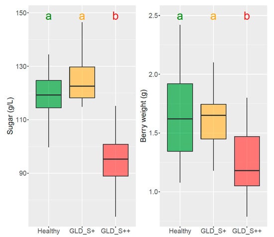 In 2018, sugar content and weight were assessed in single berries at the onset of veraison (when first visible signs of color change occurred). Sugar was significantly lower for the modality GLD_S++ when compared to the symptomless control or to GLD_S+. This sugar drop was not observed between GLD_S+ and the control (Figure 2).