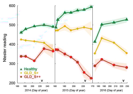 Evolution of leaf chlorophyll content (N-tester reading) during three consecutive growing seasons in Vitis vinifera cv. Pinot noir on rootstock 5BB infected or not by leafroll disease. Healthy: symptomless; GLD_S+: grapevine leafroll disease causing mild symptoms; GLD_S++: grapevine leafroll disease causing severe symptoms. Letter V represent date of veraison (i.e., change of fruit color from green to blue). Data are expressed as the mean ± standard deviation (shading).