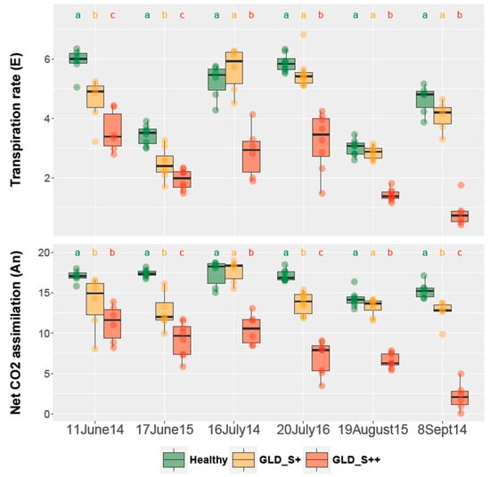 Effect of grapevine leafroll disease on gas exchange parameters in Vitis vinifera cv. Pinot noir on rootstock 5BB. Transpiration rate is expressed as mmol H2O m−2 s−1, net photosynthesis (AN) as µmol CO2 m−2 s−1. Measurements were recorded on six different days over three seasons. Means were denoted by different letters (a, b, and c) when they differ significantly at p < 0.05 using Ducan’s new multiple range test. N = 8 per treatment and date. Healthy: symptomless; GLD_S+: grapevine leafroll disease causing mild symptoms; GLD_S++: grapevine leafroll disease causing severe symptoms.