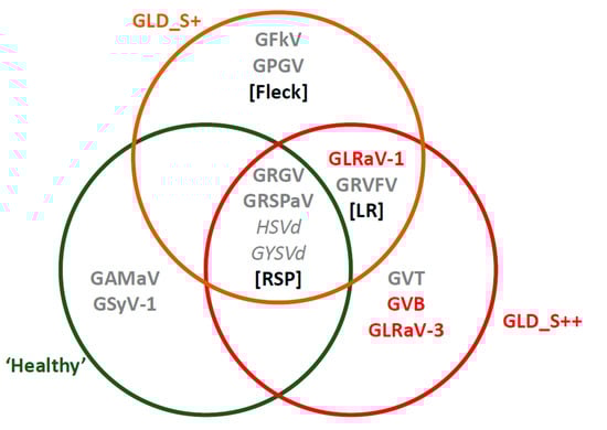 Representation of the viruses detected by High throughput sequencing and pathogen detected by biological indexing in different group (‘healthy’ (symptomless) in green, GLD_S+ in brown and GLRD_S++ in red). Colour of the virus front based on the expected pathogenicity: background (grey) or pathogen (red). Biological indexing positive detection are marked in black in []. LR is for leafroll disease observed on Vitis vinifera ‘Gamay’. Fleck is for fleck detection on Vitis rupestris ‘Saint Georges’. RSP is for Rupestris stem pitting detection on Vitis rupestris ‘Saint Georges’. Corky bark (CB) on LN33 (1613 Couderc x Thompson Seedless) and Kober stem-grooving (KSG) on Kober 5BB were also tested but all the treatments returned negative. Virus acronyms: GRSPaV—grapevine rupestris stem pitting-associated virus; GRGV—grapevine red globe virus; GAMaV—grapevine asteroid mosaic-associated virus; GSyV-1—grapevine Syrah virus 1; GFkV—grapevine fleck virus; GPGV—grapevine Pinot gris virus; GLRaV-1—grapevine leafroll-associated virus 1; GLRaV-3—grapevine leafroll-associated virus 3; GRVFV—grapevine rupestris vein feathering virus; GVT—grapevine virus T; GVB—grapevine virus B.