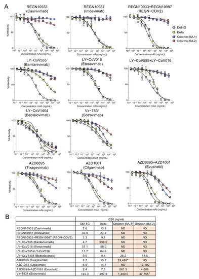 Neutralization of BA.2 by therapeutic monoclonal antibodies. (A) Lentiviral pseudotyped viruses were generated as previously described using codon-optimized 19 amino acid deleted spike proteins [24]. A fixed amount of virus, normalized for reverse transcriptase activity, was treated with 5-fold serially diluted monoclonal antibody, in duplicate, for 30 min and then used to infect ACE2.293T cells. Luciferase activity was measured after 24 h and the data are plotted as curves neutralized to luciferase activity in the absence of antibody. (B) The IC50 was calculated from the neutralization curves by GraphPad Prism 8 software. Values that approached 50% neutralization were estimated, as indicated by an asterisk (*); those that did not approach 50% neutralization were not determined (ND). IC50s with >5-fold decrease in neutralizing titer are shown in orange.