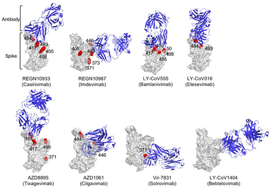 Analyses of the structures of the SARS-CoV-2 spike protein with antibody Fabs was performed with the PyMOL Molecular Graphics System, v2.1.1 (Schrödinger, LLC., Vienna, Austria). The PDB accession codes for the structures shown are 6XDG (REGN10933 and REGN10987), 7KMG (LY-CoV555), 7C01 (LY-CoV016), 7JX3 (Vir-7831), 7L7D (AZD8895), 7L7E (AZD1061), and 7MMO (LY-CoV1404).