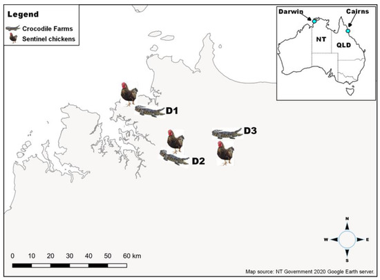 Map of Australia showing the relative locations of Darwin and Cairns in the tropical north of the continent (inset) and crocodile farms in Darwin (D1, D2, and D3) with neighbouring sentinel chicken flocks (main picture).