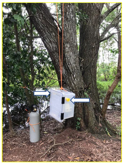 CO2-baited SMACK trap housing two honey-baited FTATM cards (arrows).