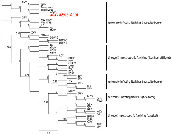 Dendrogram showing phylogenetic relationship between the prototype KOKV, KOKV A2019-0110, and other flaviviruses using a maximum-likelihood model and complete amino acid sequences. Sequences were derived using the following GenBank accession numbers: AEFV AB488408, ALFV AY898809, Bainyik virus KM225264, BgV KU308380, BinJV MG587038, BJV KC496020, CFAV KJ741267, CHAOV JQ308185, CxFV AB262759, DENV-1 U88536, DENV-2 U87411, DENV-3 AY099336, DENV-4 AF326825, DONV NC_016997, EHV DQ859060, FRV KM361634, GGYV DQ235145, HANKV NC_030401, HVV MN954647, ILOV KC734549, JEV NC_001437, KOKV AY632541, KOUV MN057643, KRV AY149905, LAMV KC692068, MMV MF139576, MODV AJ242984, MVEV AF161266, NAKV NC_030400, NANV MF139575, NHUV KJ210048, NIEV JQ957875, NMV KC788512, NOUV EU159426, OHFV AY193805, PaRV KT192549, PCV KC505248, POWV L06436, QBV FJ644291, SEPV DQ837642, SREV DQ235150, STRV KM225263, Torres virus KM225265, UGSV DQ859065, WNV KY229074, WSLV JN226796, YFV X03700, and ZIKV AY632535.