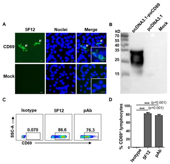mAb 5F12 specifically recognizes recombinant and natural porcine CD69 protein. (A) Recombinant porcine CD69, expressed in pcDNA3.1-poCD69-transfected HEK-293T cells, was detected by mAb 5F12 against porcine CD69. The CD69-positive cells (white arrows) and negative cells were magnified. Scale bars, 40 μm. (B) mAb 5F12 specifically recognizes recombinant porcine CD69 in the cell lysates of pcDNA3.1-poCD69-transfected HEK-293T cells but not in pcDNA3.1-transfected or un-transfected HEK-293T cells (Mock) by Western blotting. (C,D) The expression of CD69 on pig lymphocytes was detected by mAb 5F12 and polyclonal anti-poCD69 (pAb) antibodies, followed by Alexa Fluor 488-labeled goat anti-mouse-IgG antibody, via flow cytometry after stimulation with PMA (50 ng/mL) and ionomycin (500 ng/mL) for 6 h. These CD69+ lymphocytes were gated on lymphocytes within the PBMCs of pigs. *** p < 0.001.