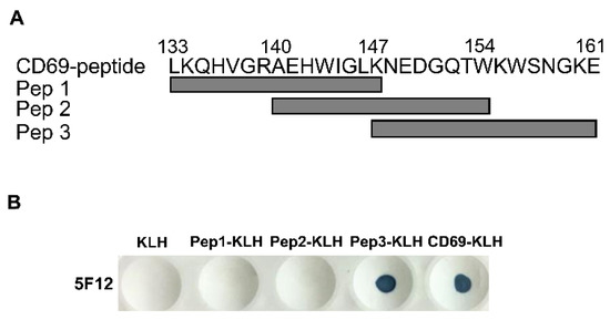 The identification of the epitope recognized by mAb 5F12 against CD69 by dot-ELISA. (A) Three overlapping peptides covering the CD69 polypeptide (aa 133–161) were synthesized and named Pep 1 (aa 133–147), Pep 2 (aa 140–154), Pep 3 (aa 147–161), an extra cysteine was added at the N terminus of each peptide for the conjugation of KLH. (B) These peptides were conjugated to KLH carrier and their reactivity with anti-poCD69 mAb 5F12 was determined by dot-ELISA.