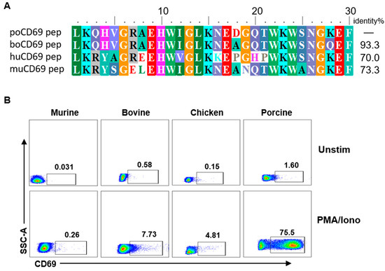 Anti-poCD69 mAb 5F12 shows weak or no cross-reactivity with bovine, mouse, and chicken CD69. (A) Homologous comparison of CD69 polypeptide (aa 133–161) in pig samples and human, mouse, and bovine samples. The percentage of homology was indicated. (B) The cross-reactivities of Dylight®755-conjugated anti-poCD69 mAb 5F12 with PBMCs from mice, cows, and chickens were examined by flow cytometry after the in vitro stimulation of PBMCs with or without PMA (50 ng/mL) and ionomycin (500 ng/mL) for 6 h (Unstim vs. PMA/Iono). The CD69+ lymphocytes were gated on lymphocytes within PBMCs. The data shown are representative of three independent experiments.