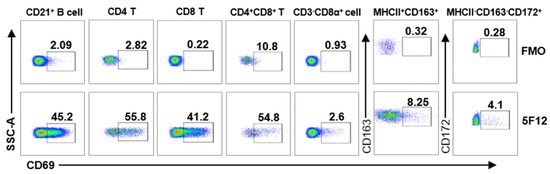 CD69, as an early activation marker, is expressed on activated B cells, T cells, NK cells, macrophages, monocytes, and granulocytes [4,33]. In order to test and validate if mAb 5F12 can be used to detect CD69 expression on different leukocyte subsets by flow cytometry, mAb 5F12 was purified and conjugated with fluorochrome DyLight®755 and then used to directly stain pig PBMCs after stimulation with PMA/ionomycin, along with a group of antibodies to define each subset, as previously reported [27,32]. As shown in Figure 4 and Figure S1, CD69 is dominantly expressed on CD21+ B cells (45.8 ± 2.65%) and T cell subsets, including CD4+ (55.83 ± 2.25%), CD8+ (42.6 ± 2.86%) and CD4+CD8+ T cells (53.1 ± 3.29%) but is only expressed slightly on NK cells (CD3−CD8α+), monocytes/macrophages (MHCII+CD163+), and neutrophils (MHCII−27CD163−CD172+) upon activation with PMA/ionomycin. These results indicate that mAb 5F12 can be used to detect CD69 expression on the activated lymphocytes of pigs using multicolor flow cytometry.