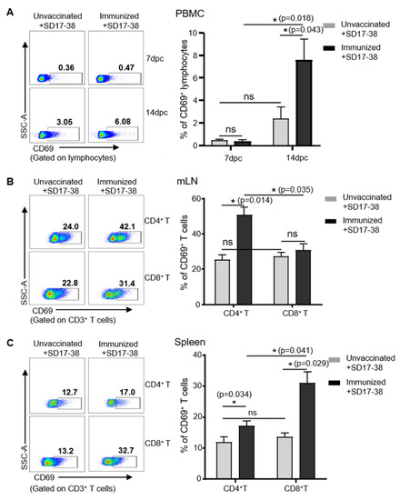 The detection of CD69 expression on T cells in different organs after PRRSV immunization and infection. PRRSV-free piglets were immunized intranasally and intramuscularly with the rJS-ORF2-6-CON vaccine or were administered RPMI-1640 (as the control), then challenged with a virulent PRRSV NADC30-like SD17-38 isolate on day 42 post-immunization. Peripheral blood, mediastinal lymph nodes (mLN), and spleens were harvested on days 7 and/or 14 post-challenge (dpc) and single-cell suspensions were prepared for the detection of CD69 expression on T cell subsets via flow cytometry. (A) Representative pseudocolor plots (left panel) and the dynamic changes (right panel) of total CD69+ lymphocytes in the PBMCs of unvaccinated (n = 3) and immunized pigs (n = 3) after challenge. (B,C) Representative dot-plots (left panel) and the comparison (right panel) of CD69+CD4+ and CD69+CD8+ T cells in the mLNs and spleens of unvaccinated (n = 3) and immunized pigs (n = 3) at 14 dpc. Data shown are mean ± SEM. ns, no statistical significance. * p < 0.05.