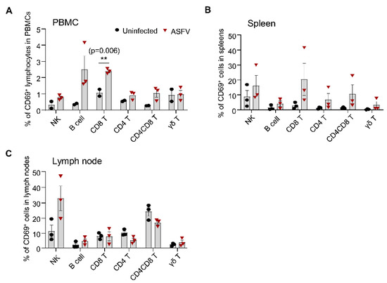 ASFV infection induces the early activation of different lymphocyte subsets in the blood and lymphoid organs of pigs. Healthy piglets were infected or not infected with the ASFV HLJ/18 strain by intramuscular injection. Peripheral blood, spleens, and submandibular lymph nodes were collected on day 5 after infection and single-cell suspensions were prepared for the detection of CD69 expression on different lymphocyte subsets, using flow cytometry. The percentages of CD69-positive NK cells, B cells, CD8, CD4, and CD4+CD8+ T cells, as well as γδ T cells in the PBMCs (A), spleen (B), and submandibular lymph node cells (C) were compared between mock-infected and ASFV-infected pigs (n = 3). Data shown are mean ± SEM. ns = no statistical significance. ** p < 0.01.