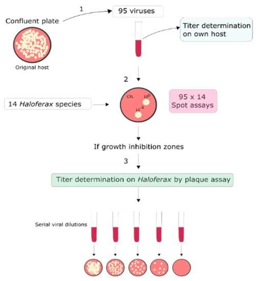 To identify novel virus–host models for Haloferax, a collection of 95 haloarchaeal viruses (Supplementary Table S2) were cross-tested with 14 Haloferax strains (Supplementary Table S1, Figure 1). The viruses were isolated from samples taken from different hypersaline environments, and they are part of the collection at the University of Helsinki. Information on the origins, host strains, virus morphologies, genomes, and taxonomic classification of the viruses can be found in Supplementary Table S2. Some of the 14 tested Haloferax strains are widely used laboratory models, such as Hfx. volcanii H26 and Hfx. mediterranei [], while several other strains were isolated quite recently from the hypersaline Lake Retba in Senegal (Supplementary Table S2) []. A scheme of the experimental pipeline for the screening is depicted in Figure 1.