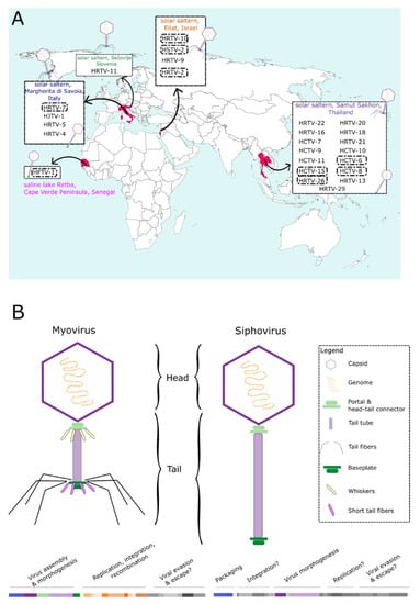 (A) Isolation sites of the haloferacalesviruses, mincapviruses, and retbasiphovirus (see also Supplementary Table S2). Schemes of the viral morphologies that were observed in each group are also indicated (see also Table 1). LR2-5 infecting viruses are circled with a dash line. (B) Schematic representation of the myovirus and siphovirus virion morphologies (not in scale) and a typical genome organization consisting of different functional modules of tailed archaeal viruses.