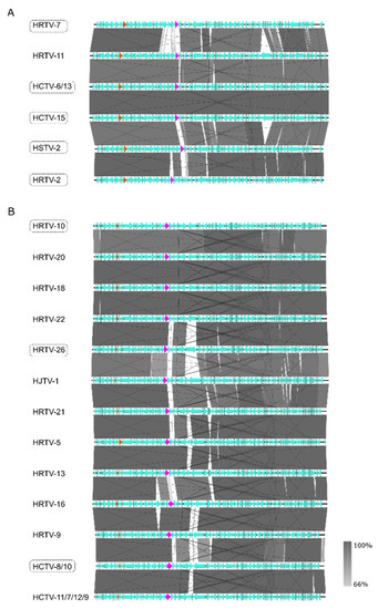 The genomic sequences of the viruses were retrieved from NCBI []. Phylogenetic trees were constructed using a custom-written R script with the package ggtree [], using the ANI values calculated with VIRIDIC []. Whole genome sequence alignments were visualized with Easyfig []. To find putative virus–host determinants, protein sequences found at variable regions of the viral genomes were downloaded from NCBI, aligned using MAFFT v. 7.450 with default settings [], and visualized by Jalview. Under-represented tetramers were detected using https://www.cmbl.uga.edu//software/signature.html (accessed on 15 December 2021), and for more complex motifs a manual search was carried out in Geneious v 8.1.9.(Auckland, New Zeeland).