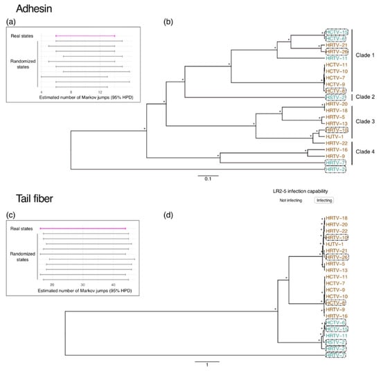 Comparison of the adhesin and tail fiber gene sequence phylogenies to the ability of viruses to infect LR2-5. (a,c) Distribution of Markov jumps (95% HPD) for (i) real states (pink) and (ii) randomized states (grey). (b,d) Bayesian maximum clade credibility tree with discrete trait reconstruction based on adhesin or tail fiber gene sequences, respectively. Asterisk indicates node posterior probabilities higher than 0.8, and viruses in the boxes can infect LR2-5. Color code indicates the genus; blue Mincapvirus, brown Haloferacalesvirus.