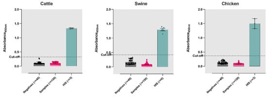 The assay’s diagnostic optical density cut-off (absorbance at 450 nm) was determined by screening pre-pandemic serum samples (n = 40 for cattle, n = 40 for swine, n = 40 for chicken). The samples with absorbance above the cut-off were considered to be positive for anti-SARS-CoV-2 antibodies, and those with absorbance below the cut-off were considered negative. Hyperimmune serum was used as the positive control in the assays.