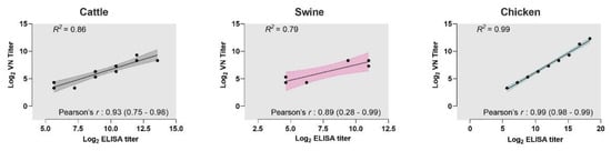 We tested if the results from the iELISAs correlated with the titers from VN assays. Pearson’s correlation coefficients showed a strong correlation with the titers from iELISAs and their VN titers (cattle: r = 0.93; 95% CI: 0.75–0.98; swine: r = 0.89; 95% CI: 0.28–0.99; chicken: r = 0.99; 95% CI: 0.98–0.99). Additionally, linear regression analyses determined the goodness-of-fit for each of the iELISA results compared with their respective VN titers. The R2 values of the iELISAs were >0.79, re-confirming the strong positive correlation between the assays (Figure 2).