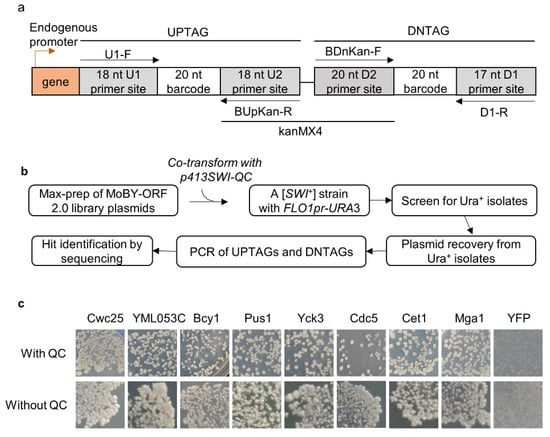 The MoBY-ORF 2.0 library carries 4527 yeast open-reading frames (ORFs) driven by their native promoters in a LEU2-based 2 µ plasmid []. In contrast to the single chromosomal copy, the library provides about 40–60 copies for each gene [], which may boost the steady-state levels of the expressed proteins. In the library, each gene is tagged at its 3′ side with two unique barcodes of 20 nucleotides separated by the kanMX4 gene, and there are primers available to amplify the two barcodes (Figure 1a). We speculated that we may identify some [SWI+]-curing/destabilizing ORFs under such an “overproduction” condition. LY770 is a [SWI+] strain carrying a URA3 reporter driven by the FLO1 promoter (FLO1pr-URA3) that can be used to monitor the prion state of Swi1. [SWI+] cells are Ura- because the FLO1 promoter is inactive, whereas non-prion cells ([swi−]) are Ura+, as functional Swi1 can activate the FLO1 promoter []. In this primary assay, we also provided an extra copy of Swi1-QC (Swi1 lacking the N region) driven by the native promoter of SWI1 (expressed from p413SWI-QC) with the intention of increasing the robustness of the assay. Under such a condition, Swi1-QC does not join the prion aggregates but can rather suppress the deficiency of using non-glucose carbon source of [SWI+] cells but has no detectable effect on the FLO1pr-URA3 reporter activity []. As described earlier [], approximately 7% of yeast genes are downregulated by [SWI+], and p413SWI-QC may help these downregulated genes to establish an overproduction condition in [SWI+] cells.
