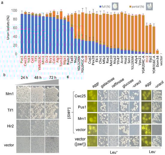 We showed previously that [SWI+] cells are not able to use alternative carbon sources other than glucose due to Swi1 aggregation and sequestration of other transcription factors required for metabolizing alternative carbon sources, such as galactose or raffinose [,]. Therefore, we further examined whether the obtained Ura+ isolates had indeed regained the ability to use galactose upon overexpression of a suppressor gene. Specifically, we examined the hit candidates Cwc25, Pus1, and Mrn1. As shown in Figure 2c, all tested Ura+ isolates upon overproduction of Cwc25, Pus1, or Mrn1 were able to use galactose or raffinose as the sole carbon source—the phenotypes expected for a [swi−] strain. Under identical conditions, Ura- isolates of the [SWI+] strain carrying a vector plasmid grew poorly in galactose and raffinose (Figure 2c). To further verify our results, the Leu+ overexpression plasmids for some hits (Cwc25, Pus1, Mrn1, Dom34) and the vector control were removed upon sequential streaking on YPD plates from the obtained Ura+ isolates, and the resulting isolates were assayed again. These isolates retained the Ura+ phenotype and exhibited diffused Swi1-NQYFP signals for the [swi−] control (Figure 2c). Combining these observations, we concluded that the Ura+ isolates generated by overproduction of the identified hit proteins had indeed lost [SWI+].