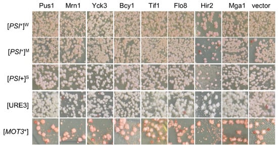 We next examined the possible suppression activities of the obtained hits against three other yeast prions: [PSI+], [URE3], and [MOT3+]. This was accomplished by transforming these prions strains with the aforementioned 15 hit plasmids individually (highlighted by the red font in Figure 2a), followed by a visualization assay of their colony colors, as described in the Methods. Briefly, we specifically examined three isogenic [PSI+] variants, one [URE3] strain, and one [MOT3+] strain, all of which contain an adenine reporter, so their prion statuses can be examined together under identical experimental conditions through a visualization assay of their colony colors. All these strains were described previously []. In all cases, prion cells form pink or white colonies on YPD, whereas non-prion cells form red colonies. Upon prion loss (curing), a change in colony color from white/pink to red should be observed. To our surprise, there were no detectable curing effects for all 15 tested hits for the examined prions of [PSI+], [URE3], and [MOT3+] (Figure 3 and Figure S1c), suggesting that the suppression effects of the identified hits are [SWI+]-specific.