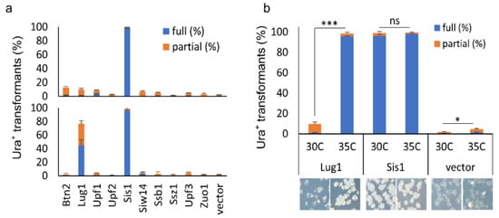 Examination of [SWI+]-curing activities of a group of documented anti-prion proteins: (a) all 10 indicated proteins were expressed in 2 μ plasmids, driven either by their native promoters (with plasmids from the MoBY 2.0, upper panel) or by GAL1 promoter in a 2 μ plasmid (lower panel). Transformants of LY770 grown on SC–leu plates (for endogenous promoters) and sucrose-based SC–leu plates with 2% galactose (for GAL1 promoter) were replica-plated onto SC–leu–ura after 3 days of growth. Transformants that fully (full (%)) and partially (partial (%)) grew on uracil-minus SC plates (Ura+) were then scored after 3 days of incubation; (b) assays were performed similarly to (a) except that transformants were either grown in an optimal temperature (30 °C) or in an elevated temperature (35 °C), with representative images shown at the bottom. Significance was estimated by t-test with the criterion—not significance (ns), p > 0.01; *, p < 0.01; ***, p < 0.0001. Data in this figure were from three independent transformation experiments. Vector, p425GAL1.