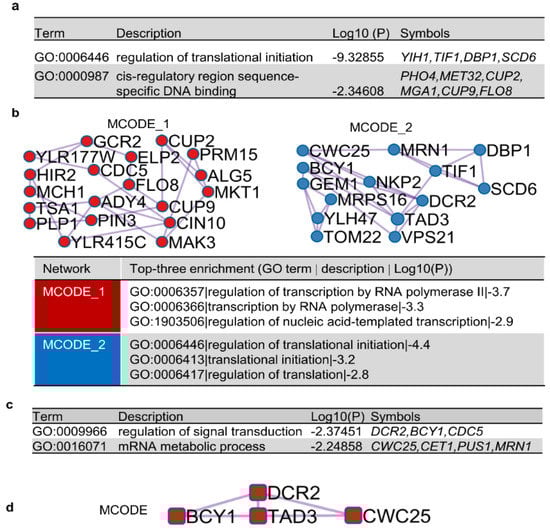 To better understand the underlying mechanisms of [SWI+] destabilization by the identified suppressors, we carried out bioinformatics analysis to identify possible pathways, functions, and cellular components targeted by those hits. We found that the 82 verified hits were involved in diverse GO terms. Although no significant enrichment was found for GO terms in specific molecular functions or cellular components, we found significant enrichment for biological processes, specifically an enrichment in two GO terms related to transcriptional regulation and translational initiation (Figure 5a). Protein–protein interaction (PPI) analyses also identified two molecular complex detection (MCODE) networks that are potentially interesting (Figure 5b). The top three GO enrichments of MCODE 1 are related to transcription, whereas the top three GO enrichments of MCODE 2 are related to translation. When a similar enrichment analysis was applied for the top 38 destabilizers only (Figure 5c,d), no enrichments were identified for the 23 [SWI+] destabilizers with slower kinetics. For the 15 prion destabilizers with faster kinetics, enrichments were found for GO terms that are associated with signal transduction and mRNA metabolic processes (Figure 5c). In the PPI analysis with the top 15 prion destabilizers with faster kinetics, only one MCODE was identified, which is composed of Bcy1, Dcr2, Tad3, and Cwc25 (Figure 5d), suggesting that these suppressors destabilize [SWI+] by targeting the same pathway with a similar mechanism. Taken together, our analyses suggest that transcription, translation, signal transduction, and mRNA metabolism were targeted by the identified [SWI+] suppressors.