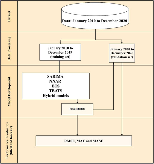 The SARIMA modeling approach is widely used in various disciplines and is regarded as one of the most efficient methods of modeling time-series data with a seasonal trend [29]. SARIMA has the advantage of requiring few model parameters for modeling and prediction. Similar to SARIMA, the ETS can deal with seasonality data. When dealing with data that exhibits heterogeneity and non-linearity, the ETS offers an advantage over SARIMA. The artificial neural network is a machine learning algorithm based on the idea of a neuron from a human brain [32,33,34]. As a result, the computer machine is able to learn and make decisions in a human-like fashion [35]. Nonlinear autoregression (NNAR) is a type of artificial neural network that uses lagged values of a time series as input to a neural network. This method incorporates the most recent observations from the same season when used with seasonal data [29]. The main difference between NNAR and SARIMA models is that NNAR can manage nonlinear sequences of time-series data better than ARIMA [33], whereas SARIMA has a better capability to take account of a linear pattern in data than NNAR. Furthermore, it is possible to model time series with different seasonality using TBATS [30,31]. With this method, a Fourier series-based trigonometric representation is used to model seasonality. The advantage of this method is the capacity to model seasonal effects of non-integer lengths [36]. Aside from simple time-series models, hybrid models that integrate forecasting methods are increasingly being used in a variety of disciplines because they typically outperform single methods [28,34,37]. In the current study, the predictive abilities of hybrid models based on the combination of SARIMA, NNAR, ETS, and TBATS, such as SARIMA-NNAR, ETS-TBATS, and NNAR-TBATS, were assessed. Supplementary Materials Table S1 provides a brief overview of the models used in this study, including their applications, assumptions, and limitations.