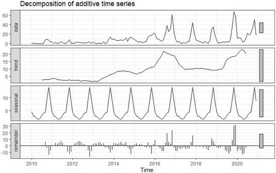 An additive decomposition of the FMD time series was carried out to describe the trends and seasonality components using R statistical software version 4.0.4 [42]. At this step, time-series data were decomposed into trend, seasonal, and residual components. The model is given as follows: