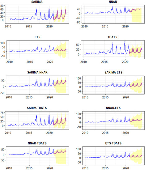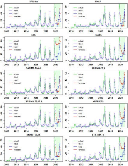Time-series hybrid models including SARIMA-NNAR, SARIMA-ETS, SARIMA-TBATS, NNAR-ETS, NNAR-TBATS and ETS-TBATS were developed using functions from the “forecast Hybrid” package and R. The functions offer the automated procedure to obtain the best fitting model. The detail of model development from the functions was previously described [8,48].