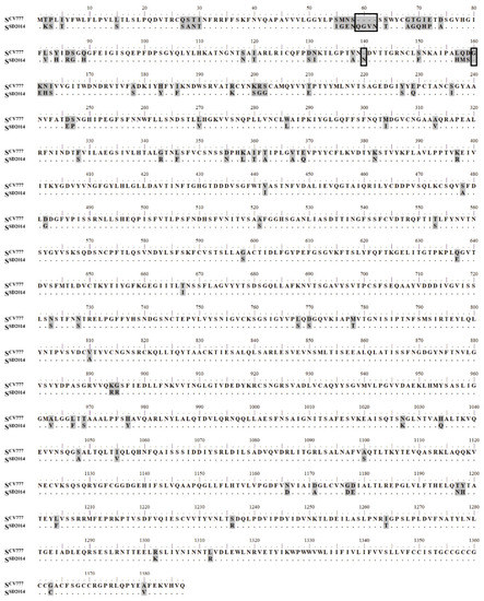 Amino acid sequence comparison of SCV777 and S protein of PEDV SD2014 (SSD2014). Amino acid sequences of SCV777 and SSD2014 (AND76936) were aligned with Mega 7. Differential amino acids were shaded with grey. The identical amino acid in the sequence of SSD2014 was substituted with a “.”; The amino acid in rectangle was the insertion/deletion site.