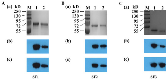 Reactivity of anti-S protein fragment 1 (SF1) sera with SF1 (A), anti-SF2 serum with SF2 (B), and anti-SF3 serum with SF3 (C). (a). SDS-PAGE analysis of purified SFs. (b,c). Western blot analysis with anti-SFs of PEDV CV777 (SFsCV777) and anti-SFs of PEDV SD2014 (SFsSD2014) sera as the primary antibody, respectively. Lane M: Protein marker; lane 1 and 2: Purified SFsCV777 and SFsSD2014, respectively.