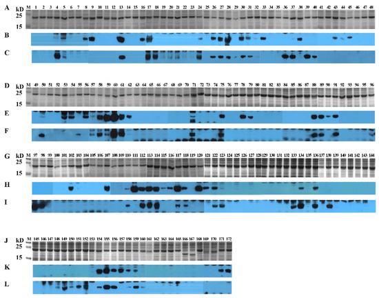 SDS-PAGE and Western blotting analysis of 16-mer- and 10-mer SSD2014-derived peptides. One hundred and seventy-two 16-mer peptides and one 10-mer peptide covering the entire SSD2014 were GST-fusion expressed in E. coli BL21. After induction, cells were harvested by centrifugation, and cell pellets were resolved by SAS-PAGE using 15% gels. Gels were either stained or processed for Western blots. PVDF membranes were first blocked with 5% (w/v) skimmed milk, incubated sequentially with anti-S serum and goat anti-rabbit IgG, and then visualized by enhance chemiluminescence. (A,D,G,J): SDS-PAGE analysis of 172 GST-fusion expressed 16-mers and one 10-mer. (B,E,H,K): Western blot analysis of 172 GST-fusion expressed 16-mers and one 10-mer with anti-SSD2014 serum. (C,F,I,L): Western blot analysis of 172 GST-fusion expressed 16-mers and one 10-mer with anti-SCV777 serum. 1–173: GST-fusion expressed 16-mers (P1–P172) and 10-mer (P173).