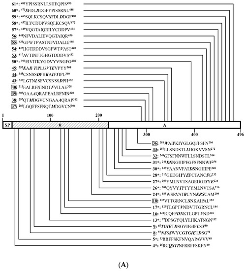 Using the same strategy as in 3.4 to identify linear BCEs on SCD2014, both anti-SCV777 and anti-SSD2014 sera were used to screen the positive peptides fusion-expressed with GST tags. Except for the 4 16-mers (P167–P170), which span part of the TM domain and its immediate downstream, the other 168 GST-fusion 16-mers or one 10-mer were successfully expressed (Figure 7). From the 169 expressed peptides, 56 and 45 positive 16-mers were identified by anti-SSD2014 and anti-SCV777 sera, respectively (Figure 7). Among the positive 16-mers identified, 33 (P4–P5, P13–P14, P17–P18, P22, P26–P28, P33, P60–P61, P89, P91–P92, P111–P114, P117–P118, P123, P135, P137, P149, P151, and P155–P160) were Co-RecoMers (Figure 7). Twelve positive 16-mers (P34, P54, P56, P62–P63, P76, P88, P107–P108, P116, P119, and P172) were anti-SCV777serum-specific, and 23 16-mers (P19, P30–P32, P35–P38, P40, P45, P50–P51, P71–P72, P93, P96–P98, P115, P125, P138–P139, and P150) were anti-SSD2014 serum-specific. Therefore, 68 positive 16-mer were totally identified on SSD2014, of which 66.2% could be recognized by anti-SCV777 serum, and 82.4% could be bound by their own anti-serum.
