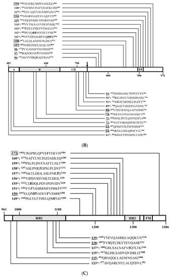 Distribution of positive peptides on SF1SD2014 (A), SF2SD2014 (B), and SF2SD2014 (C). The horizontal bar represents the primary structure of SSD2014 protein, of which the domains were framed as in Figure 1. Numbers assigned to the 16-mer or 10-mer peptides are the same in Figure 7. The numbers underlined mark peptides that are anti-SSD2014 serum-positive. The numbers in boxes mark the peptides that are anti-SCV777 serum-positive; Numbers with “*” mark peptides recognized by both anti-SCV777 serum and anti-SSD2014 serum (Co-RecoMers). The positions of each peptide in SSD2014 protein are indicated with superscripts. The arrow shows the boundary of S1/S2.
