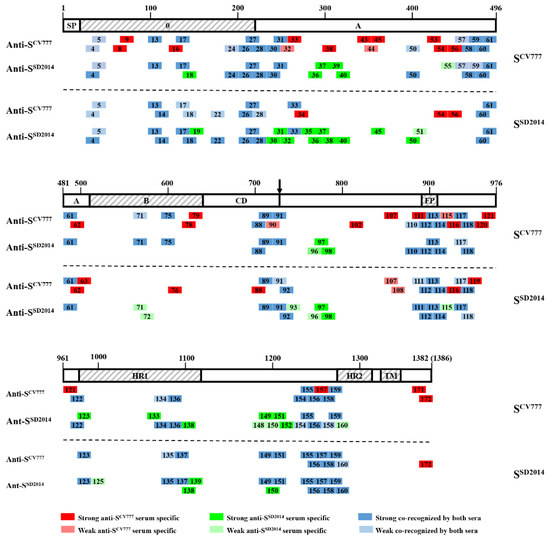 Distribution of positive peptides on SF1CV777 (A), SF2CV777 (B), and SF2CV777 (C). The horizontal bar represents the primary structure of SCV777 protein, of which the functional domains are framed as Figure 1A. Numbers assigned to the 16-mer or 14-mer peptides are the same as in Figure 5. Numbers underlined mark the peptides that are anti-SCV777 serum-positive; Numbers in boxes mark peptides that are anti-SSD2014 serum-positive; Numbers with “*” mark peptides recognized by both anti-SCV777 serum and anti-SSD2014 serum (Co-RecoMers). The positions of each peptide in the SCV777 protein were indicated with superscripts. The arrow showed the boundary of S1/S2.