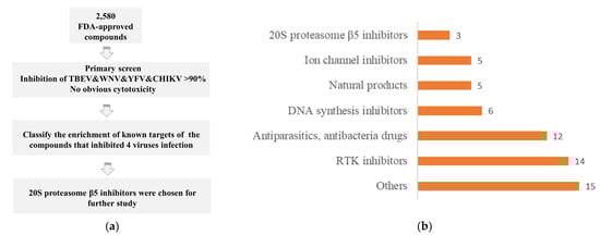 A high-throughput screening assay was performed to screen antiviral candidates against TBEV, WNV, YFV and CHIKV from 2580 FDA-approved small-molecule drugs. Huh7 cells and TBEV, WNV, YFV and CHIKV viruses were used for this screening. Figure 1a shows the procedure used in the screening assay. In total, 60 compounds showed potent antiviral activity against TBEV, WNV, YFV and CHIKV, meaning they could inhibit the infection of the four viruses by more than 90% in Huh7 cells at a final concentration of 5 μM. To validate the antiviral activity of these 60 compounds, monkey kidney epithelial cells, Vero cells, were utilized. Thrillingly, all of the compounds exerted inhibitory effects against the four viruses by more than 85% in Vero cells at a final concentration of 5 μM, which suggested that the antiviral activities of these compounds were not cell-dependent. Ivacaftor (an enhancer of the cystic fibrosis transmembrane conductance regulator) was identified to show antiviral activity for the first time. Additionally, two compounds, telotristat etiprate and sonodegib, which have also been reported to inhibit SARS-CoV-2 in screening studies, were identified to inhibit the infection of TBEV, WNV, YFV and CHIKV [12,13]. The enrichment of the known targets of these 60 drugs was analyzed and classified (Table S1). Six main targets were classified: receptor tyrosine kinase (RTK), 20S proteasome β5, ion channel, DNA synthesis, antibacteria or protozoa drugs and natural products (Figure 1b). Numerous studies report RTK inhibitors, ion channel inhibitors, DNA synthesis inhibitors, antibacteria or protozoa drugs and natural products to be arbovirus antivirals [14,15,16,17]. However, little work has been conducted regarding 20S proteasome β5 inhibitors as direct-acting antivirals. In this study, the antiviral efficacy of three 20S proteasome β5 inhibitors, ixazomib, ixazomib citrate and carfilzomib, was further evaluated.