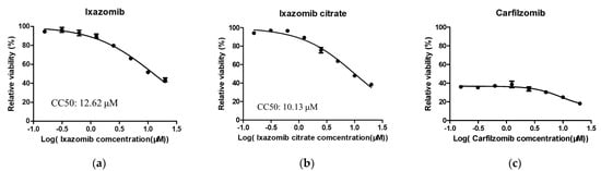 (a) Ixazomib; (b) Ixazomib citrate and (c) Carfilzomib: Cell viability detection of three 20S proteasome β5 inhibitors in Huh7 cells. Huh7 cells were treated with eight 2-fold serial dilutions (20–0.15625 μM) of three 20S proteasome β5 inhibitors. The cells were maintained at 37 °C and at 5% CO2 for 48 h before a CCK-8 assay was performed. Data are normalized to the average of DMSO-treated wells and represent mean ± SEM for n = 3 independent experiments.