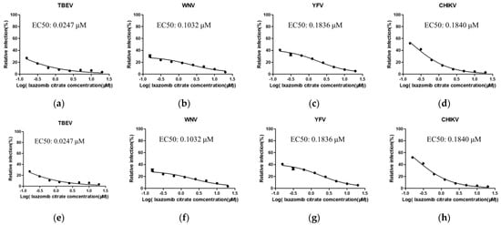 The antiviral activity of the selected compounds was further validated by carrying out dose–response studies. In total, 1 × 104 Huh7 cells were seeded in 96-well plates. Then, 12 h later, the cells were treated with eight 2-fold serial dilutions of compounds. The final concentration of the compounds ranged from 20 μM to 0.15625 μM. DMSO was used as a control. Viruses’ working stocks were added to the treated Huh7 cells at a MOI of 0.1. Next, 24 h after the virus incubation, the infection rate of the viruses was determined using immunofluorescence imaging, as described above. The concentration of 50% of the maximal effect (EC50) of each compound was calculated in Prism. In addition, parallel plates that were not infected were analyzed to monitor the cytotoxicity of each compound. The cells were maintained at 37 °C and at 5% CO2 for 48 h before a CCK-8 assay was performed, following the manufacturer’s instructions (Beyotime, Shanghai, China). The A450 was read using Synergy 2 (BioTek, El Segundo, CA, USA). The CC50 of each compound was calculated in Prism.