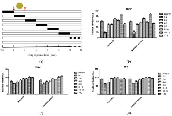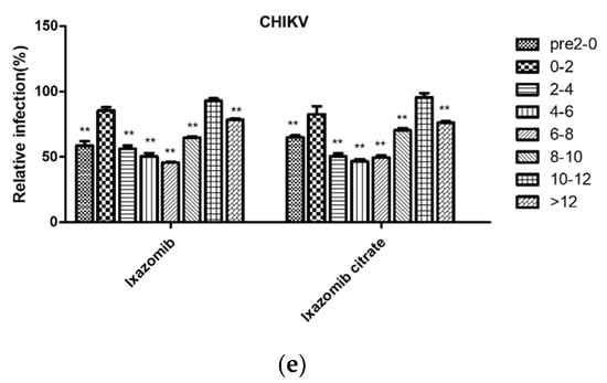 To investigate which stages of the TBEV, WNV, YFV and CHIKV life cycles were interrupted by ixazomib, a time-of-drug-addition assay was performed by treating virus-infected Huh7 cells with ixazomib or ixazomib citrate at various virus-specific time points, followed by immunofluorescence imaging 24 h post infection (hpi) (Figure 4a). Ixazomib inhibited TBEV infection in multiple periods. The prominent suppressive activity of ixazomib against TBEV occurred when it was maintained at 0–2 hpi, the stage of cell entry after attachment, which revealed that ixazomib inhibited mostly TBEV in the entry stage (Figure 4b). WNV and YFV infection was disrupted by ixazomib when it was maintained at 0–2 hpi and 2–4 hpi, suggesting ixazomib was involved in the viral entry and replication processes of both viruses (Figure 4c,d). Intriguingly, ixazomib significantly suppressed TBEV, WNV and YFV at 0–2 hpi, while ixazomib showed no inhibitory effect for CHIKV when it was maintained between 0 and 2 hpi, but it inhibited CHIKV infection when it was maintained at pre 2–0 hpi and 2–10 hpi (Figure 4e). The best suppressive activity was observed at 4–8 hpi, which demonstrated that ixazomib mostly interfered with the replication and package of CHIKV. At present, there are no relevant literature reports regarding the role of the 20S proteasome β5 in the infection process of TBEV, WNV, YFV and CHIKV. Whether ixazomib inhibited virus infection by suppressing the activity of 20S proteasome β5 remains unclear. Additionally, the mechanisms of ixazomib inhibiting TBEV, WNV, YFV and CHIKV need to be investigated further.