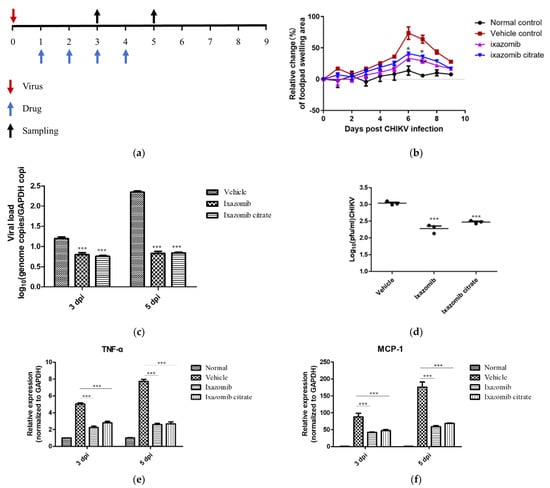 To evaluate the antiviral effect of ixazomib in vivo further, a CHIKV infection mouse model was utilized. Four-week-old female C57BL/6 mice were divided into four groups: three groups received one of the following treatments beginning on day 1 after infection: vehicle, ixazomib (7 mg/kg) or ixazomib citrate (11 mg/kg), via oral administration at suitable doses; one group was used as a normal control group which did not undergo CHIKV infection. Animals were monitored for footpad swelling in the left rear foot, and viral loads in the left rear hamstring muscle were monitored at different times after infection and treatment. CHIKV-infected mice showed one peak of clinically apparent footpad swelling 6 days after infection. Compared with the vehicle-treated group, ixazomib and ixazomib citrate significantly alleviated the footpad swelling caused by CHIKV infection (Figure 5b). Additionally, the virus loads in the left rear hamstring muscles of mice with ixazomib and ixazomib citrate treatments were distinctly reduced compared with those of the vehicle-treated group when assayed on 3 dpi and 5 dpi (Figure 5c). The results demonstrated that ixazomib can effectively alleviate footpad swelling and suppress viral replication in mouse muscles. Concurrently, compared with the vehicle group, ixazomib or ixazomib citrate treatment decreased the viremia at 3 dpi (Figure 5d), while no CHIKV infection was detected at 5 dpi in all three groups (data not shown). In addition, the mRNA expression levels of monocyte chemoattractant protein 1 (MCP-1) and tumor necrosis factor alpha (TNF-α) in the left rear hamstring muscle tissues were determined. At 3 dpi and 5 dpi, the MCP-1 and TNF-α mRNA expression levels were remarkably diminished in the mice treated with ixazomib and ixazomib citrate (Figure 5e,f). Taken together, ixazomib and ixazomib citrate inhibited CHIKV infection in vivo and attenuated inflammation caused by CHIKV.