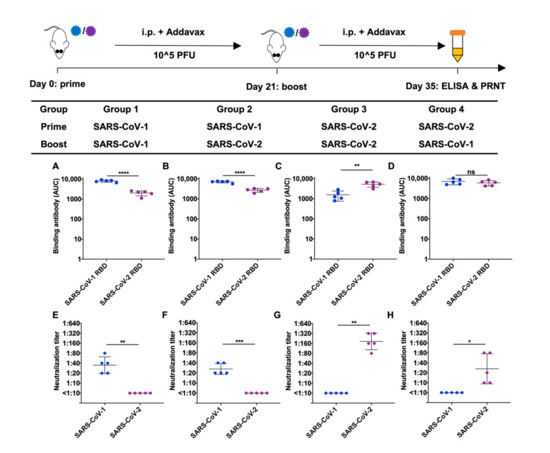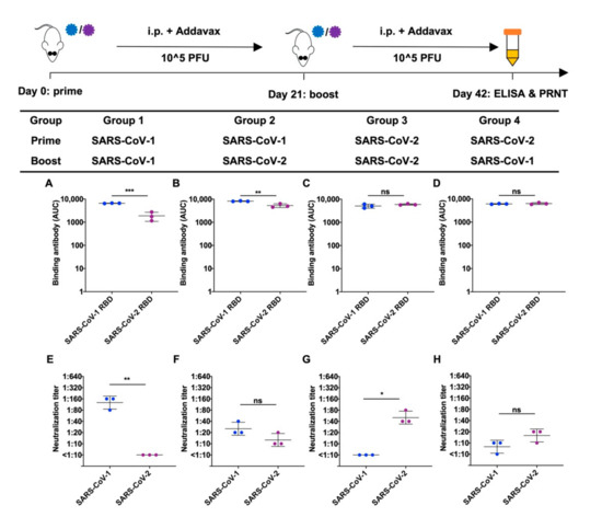 Binding and neutralization of mouse plasma 14 days after homologous or heterologous immunization of SARS-CoV-1 and SARS-CoV-2. Plasma samples were collected 14 days (day 35) after two rounds of immunization (prime-day 0, boost-day 21) with SARS-CoV-1 or SARS-CoV-2 as illustrated. (A–D) RBD (receptor binding domain) proteins from SARS-CoV-1 and SARS-CoV-2 were used as the antigen coating on the ELISA plates. Binding of RBD to serial diluted plasma sample was analyzed from five mice immunized using (A) SARS-CoV-1 homologous prime-boost, (B) heterologous SARS-CoV-1-prime, SARS-CoV-2-boost, (C) SARS-CoV-2 homologous prime-boost, and (D) heterologous SARS-CoV-2-prime, SARS-CoV-1-boost. AUC, area under the curve. (E–H) Neutralizing titers (PRNT90) of plasma samples from mice immunized with (E) SARS-CoV-1 homologous prime-boost, (F) heterologous SARS-CoV-1-prime, SARS-CoV-2-boost, (G) SARS-CoV-2 homologous prime-boost, and (H) heterologous SARS-CoV-2-prime, SARS-CoV-1-boost, were analyzed by a PRNT (plaque reduction neutralization test) assay. Each data point in the figure represents the mean of two replicates. Error bars represent standard deviation. p-values were calculated using a two-tailed t-test (* p < 0.05, ** p < 0.01, *** p < 0.001, **** p < 0.0001, ns (not significant)).