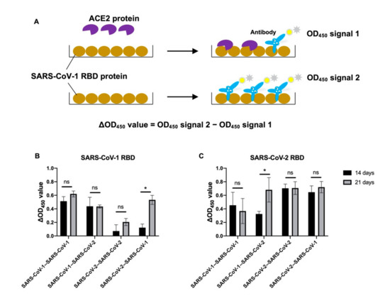 A previous study showed that the neutralization titers in the blood are correlated with the level of antibodies that can block the interaction between SARS-CoV-2 RBD and angiotensin-converting enzyme 2 (ACE2) [24]. Since we found that heterologous immunization induced substantial level of binding antibodies against the RBD of both subtypes, we thus established an ACE2-competition assay to determine the level of antibody in the plasma that binds to the same epitopes as RBD, which are used for interacting with ACE2 protein (Figure 3). ACE2 was first incubated with the RBD so that it could occupy the interacting epitopes. The antibodies in the plasma thus can only bind to the regions that do not participate in the RBD–ACE2 interaction. In this assay, plasma samples with stronger ACE2 competition activity will show higher reduction in antibody binding signal to RBD when the ACE2 protein is added as a competitive agent in the ELISA assay (Figure 3A). We used ΔOD450 value to represent the level of antibody that binds to the ACE2 binding epitope. Of note, a high ΔOD450 value means increased ACE2 competition from day 14 to day 21, while a low ΔOD450 value indicates there is less or change between day 14 and day 21. Interestingly, there was a significant increase in ACE2 competition activity on SARS-CoV-1 RBD in the plasma of the mice collected at 21 days after heterologous SARS-CoV-2/SARS-CoV-1 immunization. This result is consistent with the observation that neutralization against SARS-CoV-1 was found at 21 days but not at 14 days after heterologous immunization using this strategy (Figure 1H and Figure 2H). Similar results were also found in SARS-CoV-2 RBD ELISA in the plasma samples collected at 21 days from the mice with SARS-CoV-1/SARS-CoV-2, as the prime/boost subtypes showed significantly higher ACE2 competition activity than those collected at day 14 under the same conditions (Figure 3B, C).